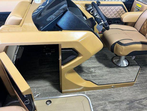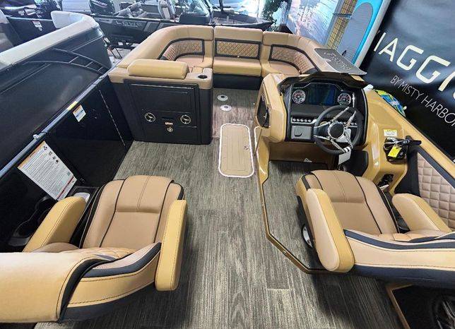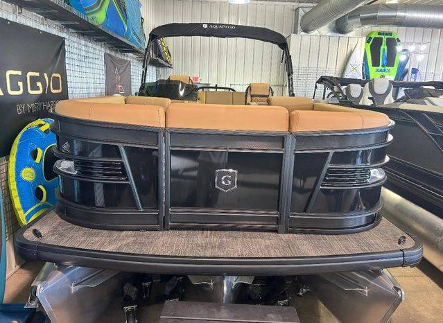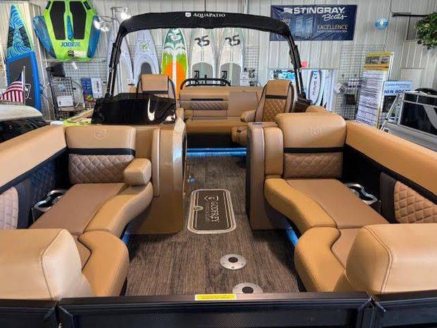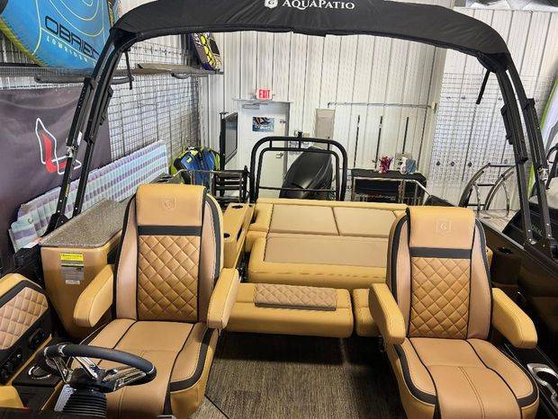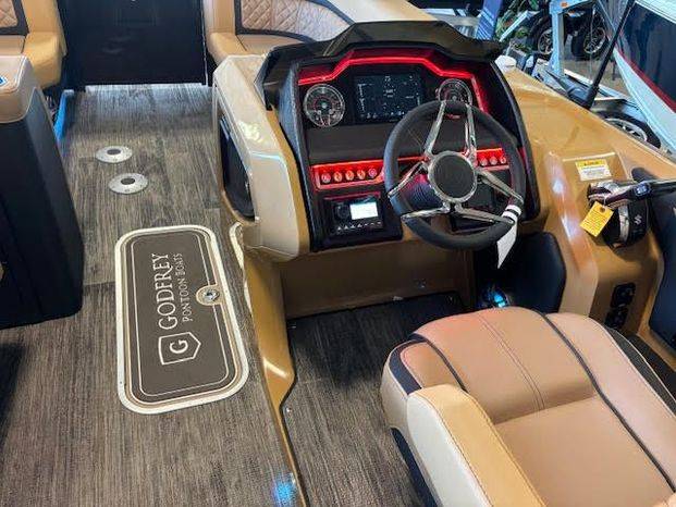 Hottest Godfrey on the market! The 2025 Godfrey AquaPatio dual flip lounge tritoon offers a comfortable and luxurious boating experience with features like plush seating, a premium sound system, and RGB lighting. It also includes an electric bimini top and multiple seating options.