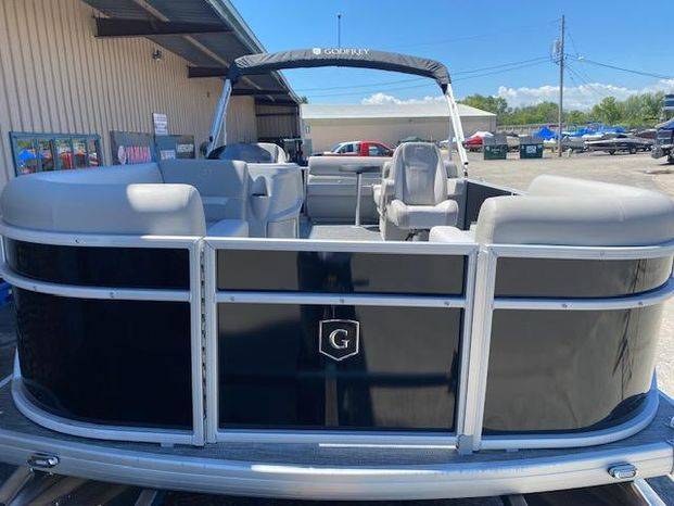 Check out this really nice 2025 Godfrey Xperience Cruise pontoon in Black Fence with Gray Vinyl interior, Mercury 115hp 4-Stroke engine, Manual canopy w/ black protective boot and playpen cover, Keel strips, Silver corner castings, Silver EZ climb stern ladder, LED docking lights, Stainless Steel fixed cleats, Platinum weave full flooring, Captain/co-captain chair-swivel, slider, reclining, fold down arms, 2 movable cupholders, Round stern table, Extreme steering w/ tilt wheel, Fusion stereo w/ 2 grey speakers, Windscreen, Wireless phone charger-gimbal mount, and Much More!