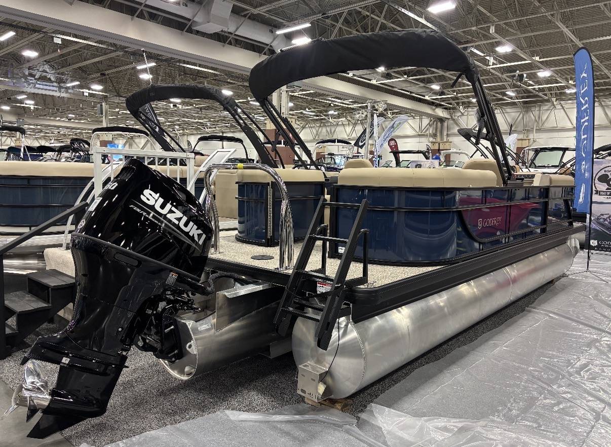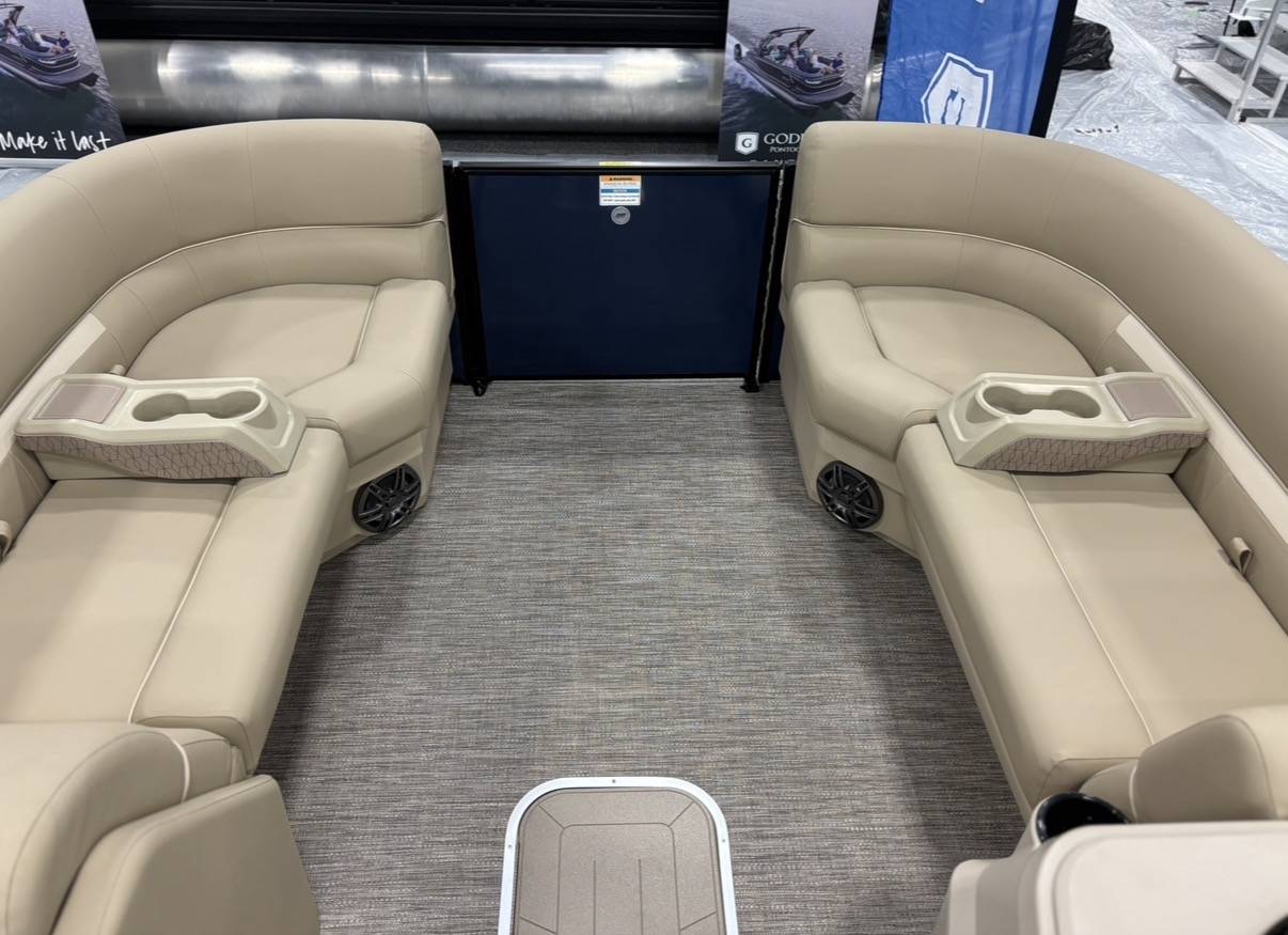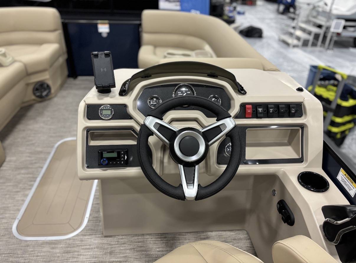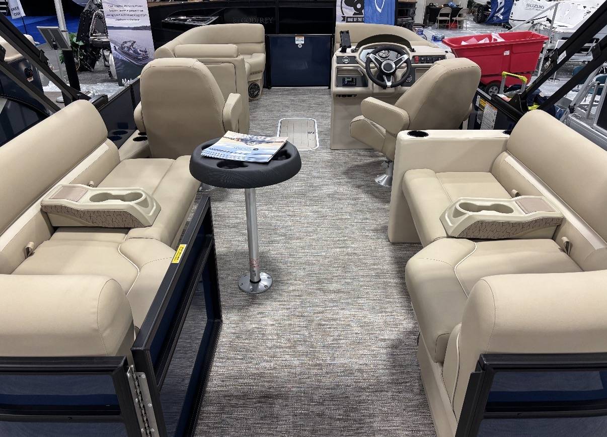 Versatile 22-foot pontoon boat designed for family fun, featuring a split bench or single flip lounge layout, modern styling, ample under-seat storage, a swim deck, and a Clarion Bluetooth stereo, powered by a 150 HP Suzuki, perfect for cruising, watersports, and relaxing on the water with its quality vinyl flooring and comfortable captain/passenger seating