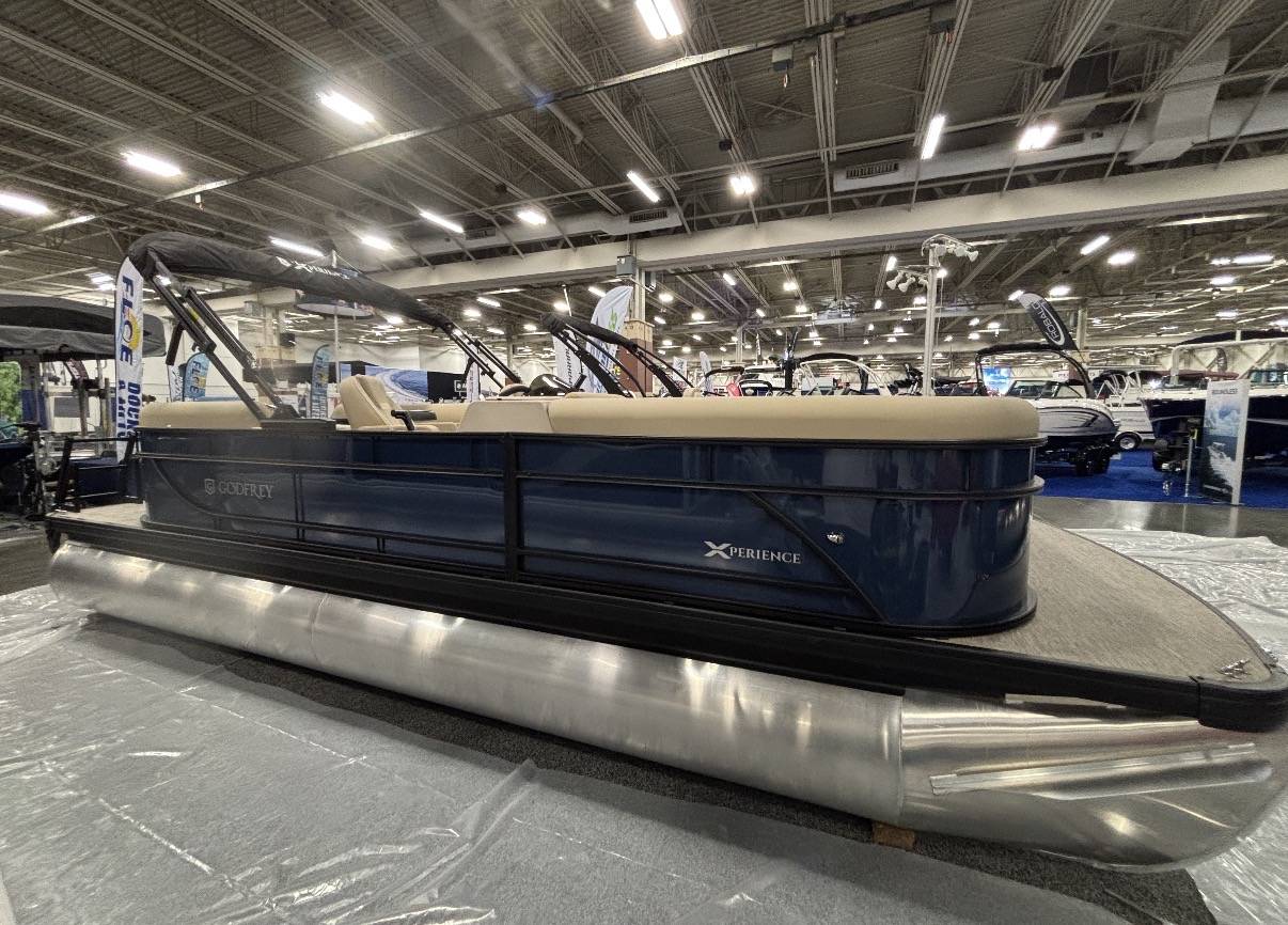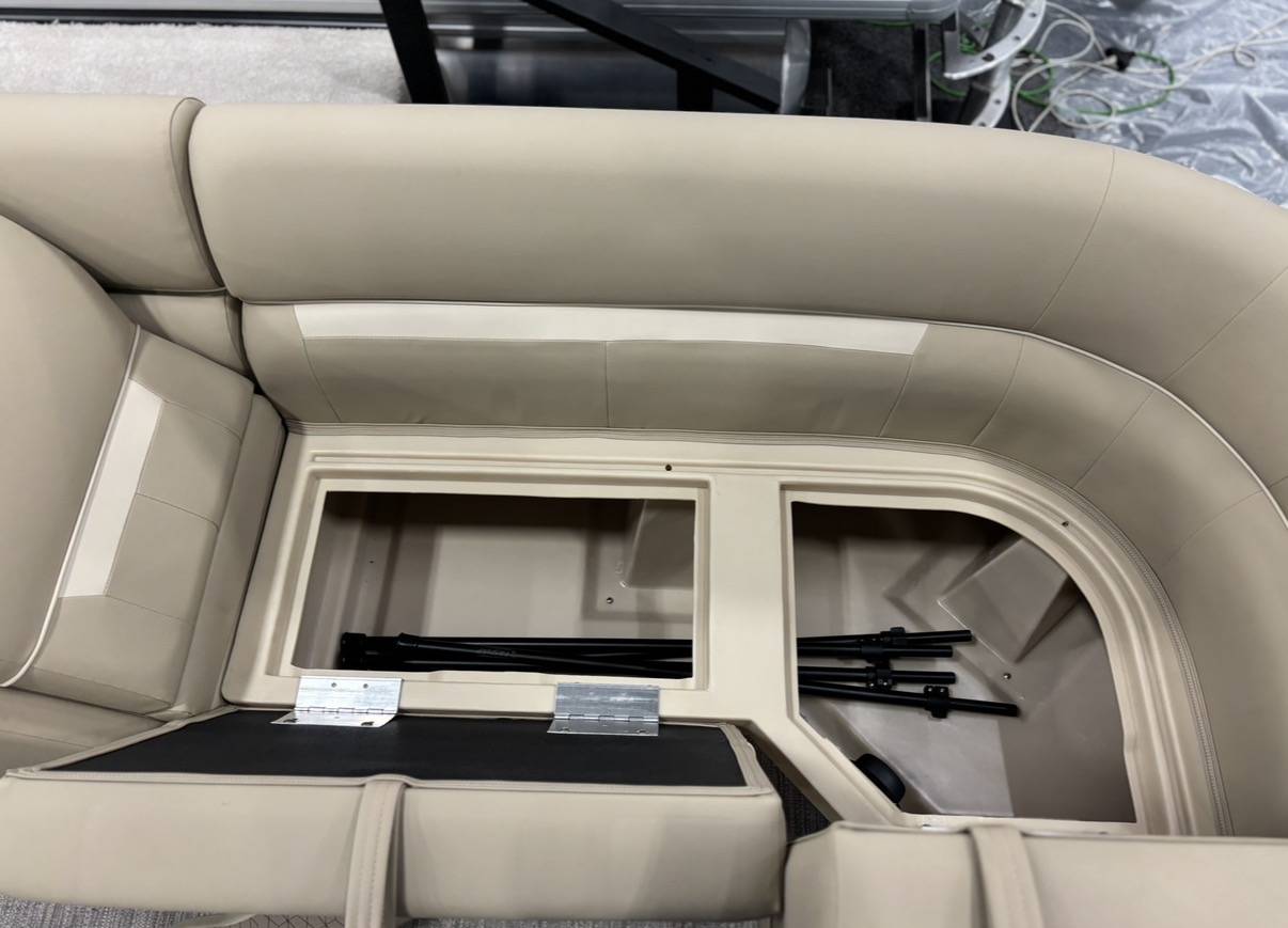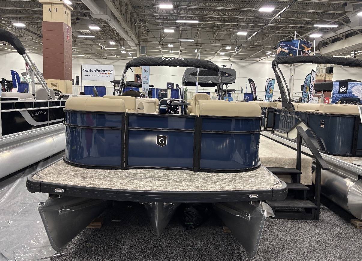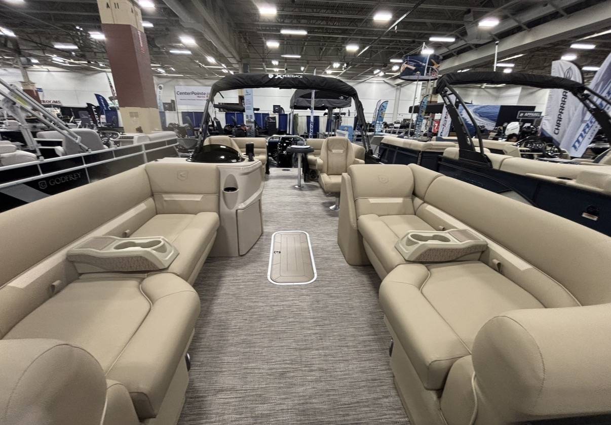 Versatile 22-foot pontoon boat designed for family fun, featuring a split bench or single flip lounge layout, modern styling, ample under-seat storage, a swim deck, and a Clarion Bluetooth stereo, powered by a 150 HP Suzuki, perfect for cruising, watersports, and relaxing on the water with its quality vinyl flooring and comfortable captain/passenger seating