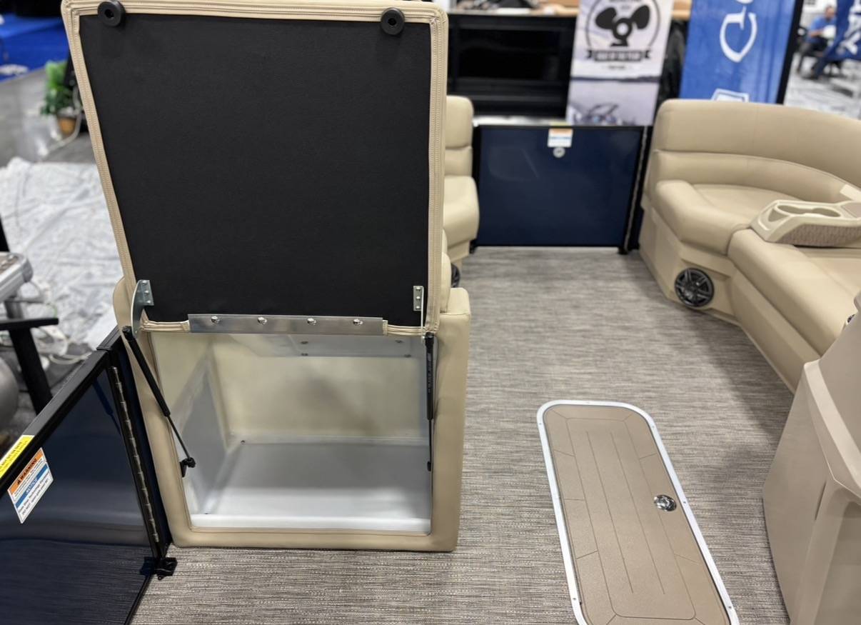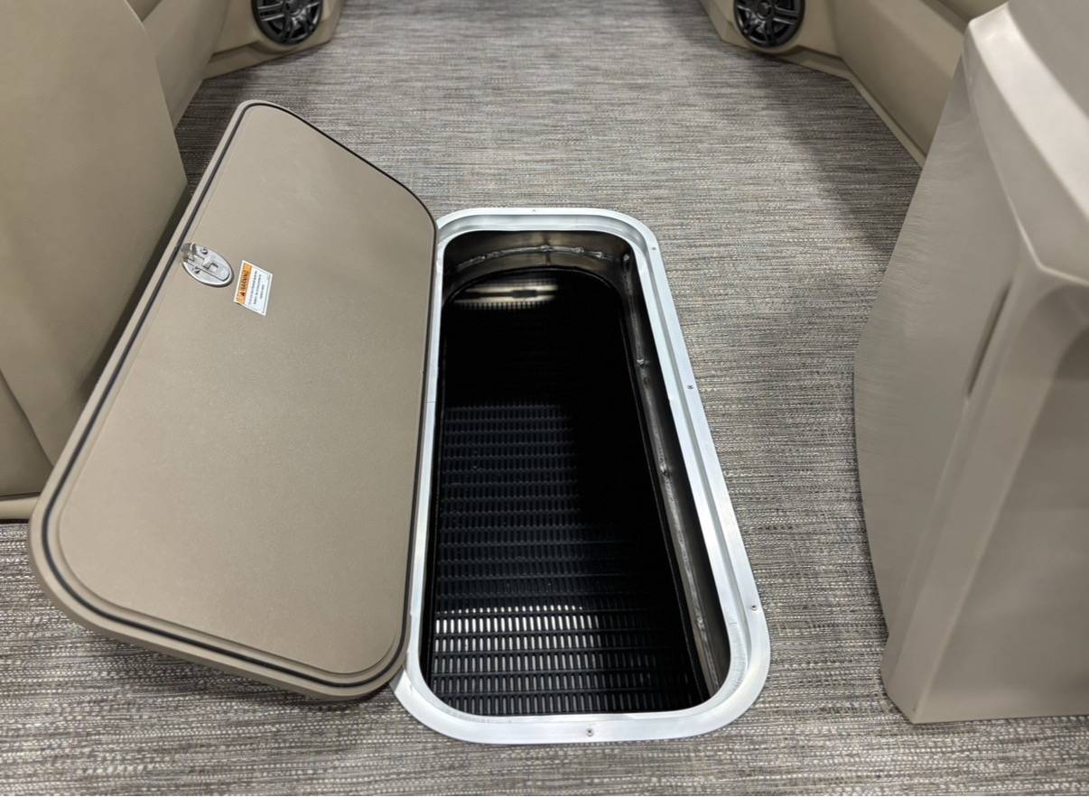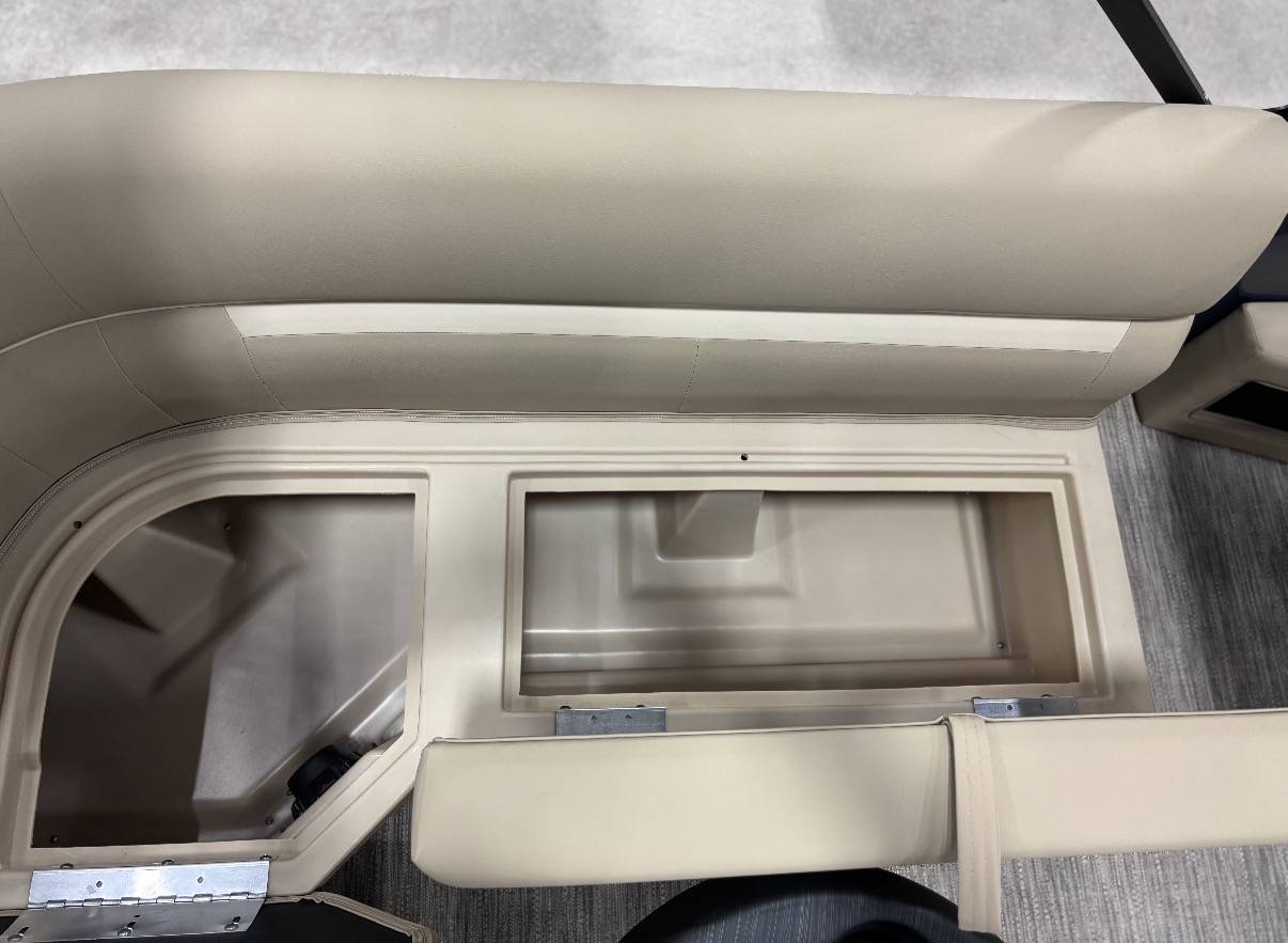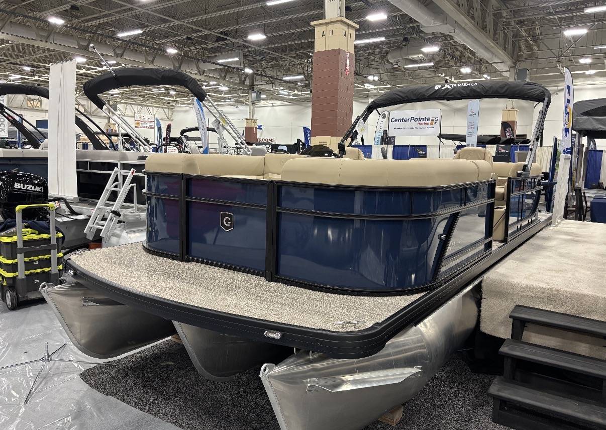 Versatile 22-foot pontoon boat designed for family fun, featuring a split bench or single flip lounge layout, modern styling, ample under-seat storage, a swim deck, and a Clarion Bluetooth stereo, powered by a 150 HP Suzuki, perfect for cruising, watersports, and relaxing on the water with its quality vinyl flooring and comfortable captain/passenger seating