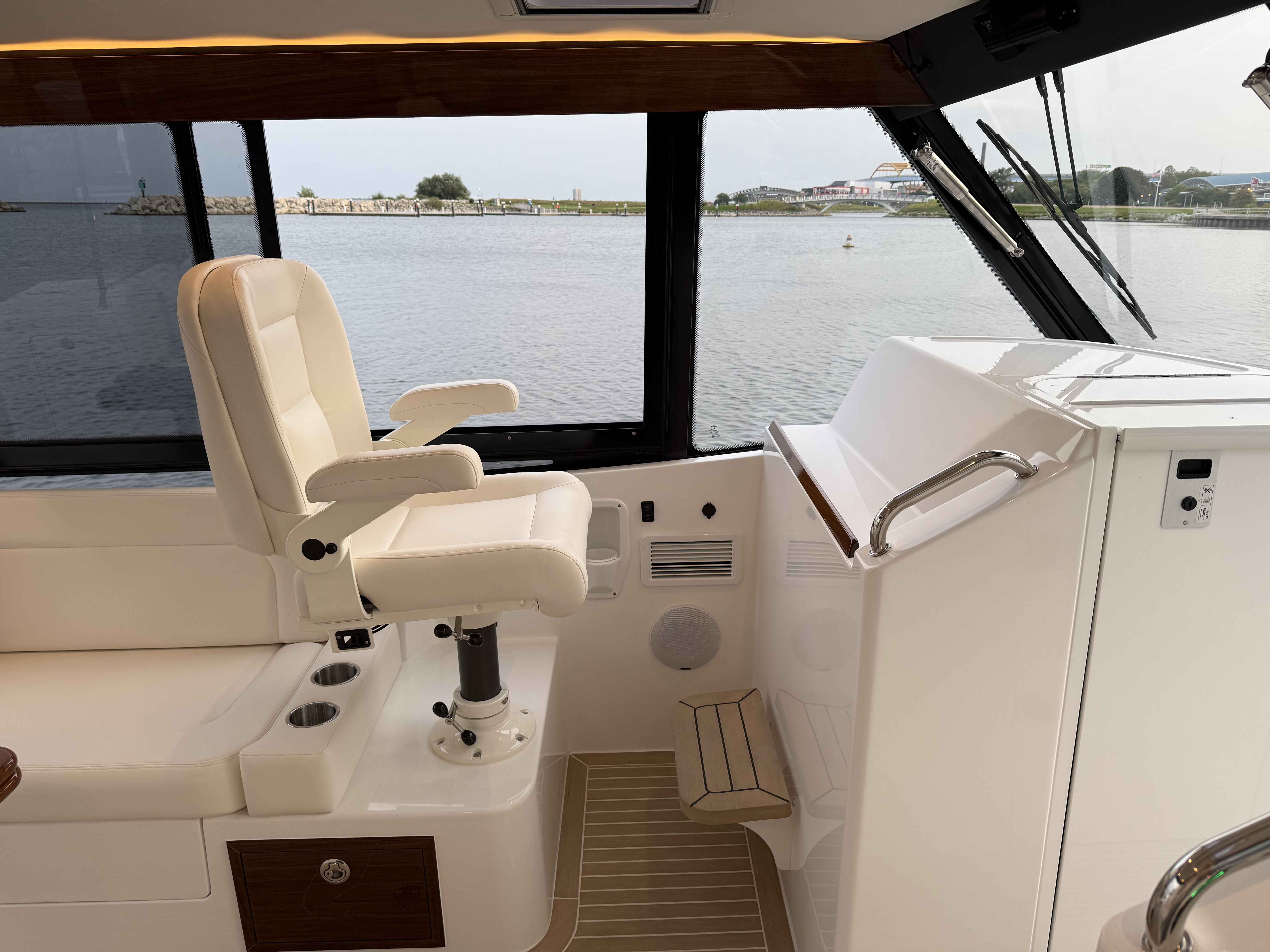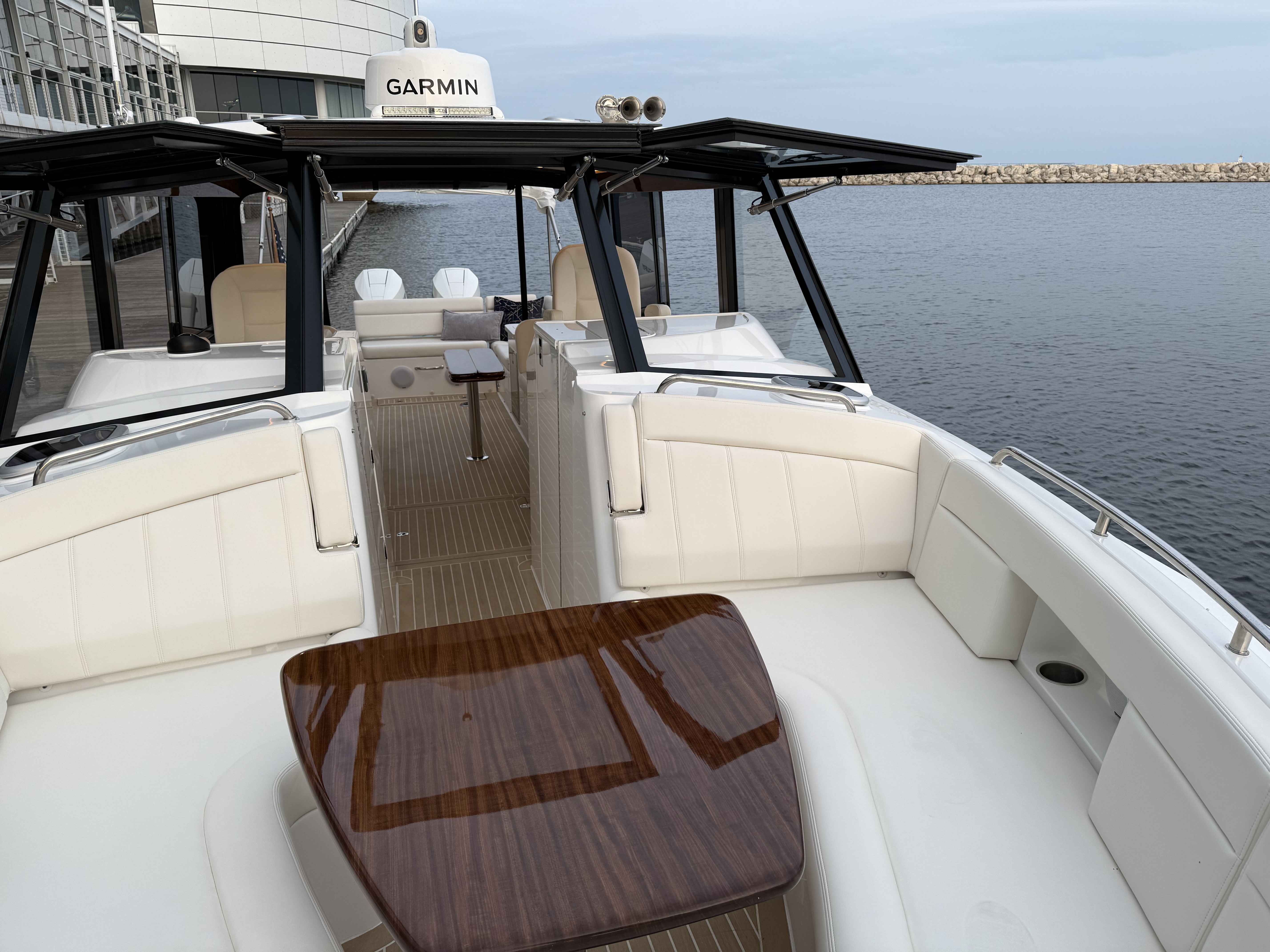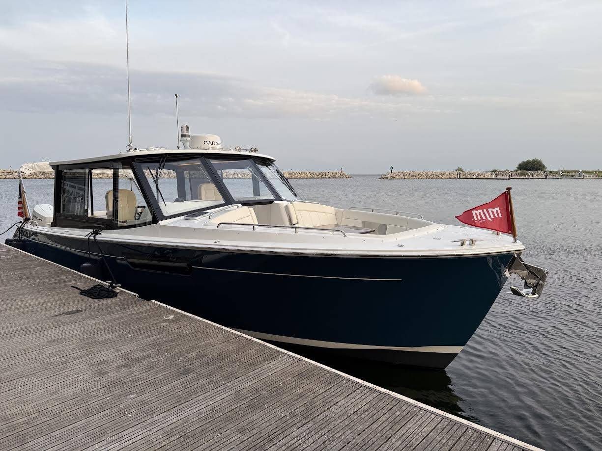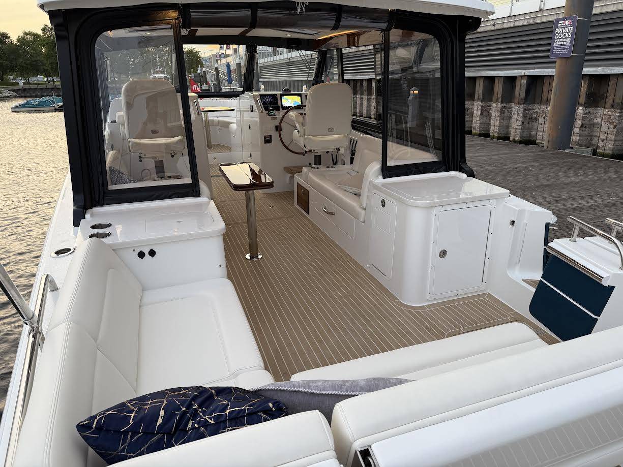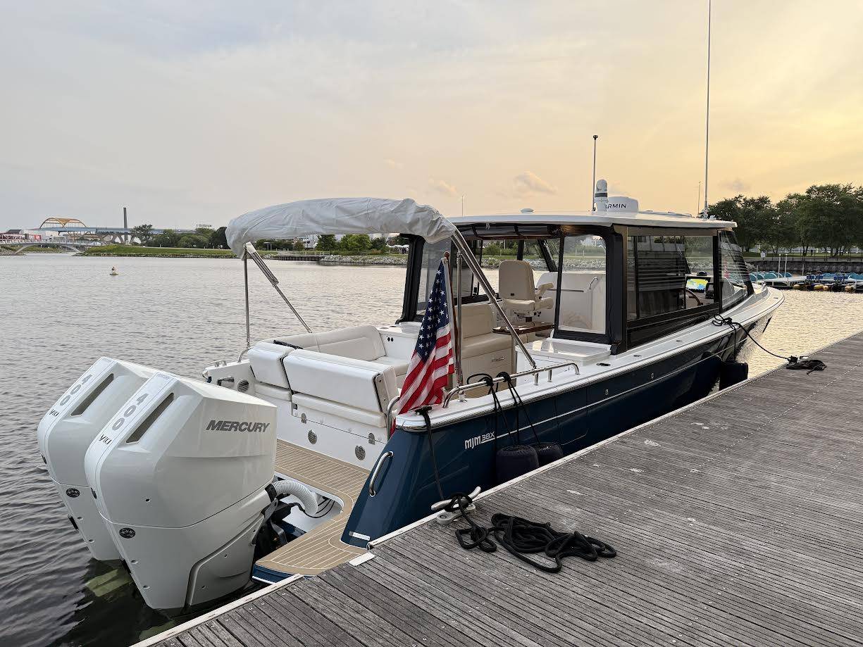 This elegant MJM 38X just arrived to our Milwaukee showroom and is stunning at every look. Please excuse the plastic covering the upholstery. We want to preserve the fresh from the factory condition of this vessel! Visit us now to witness what separates MJM from the rest.