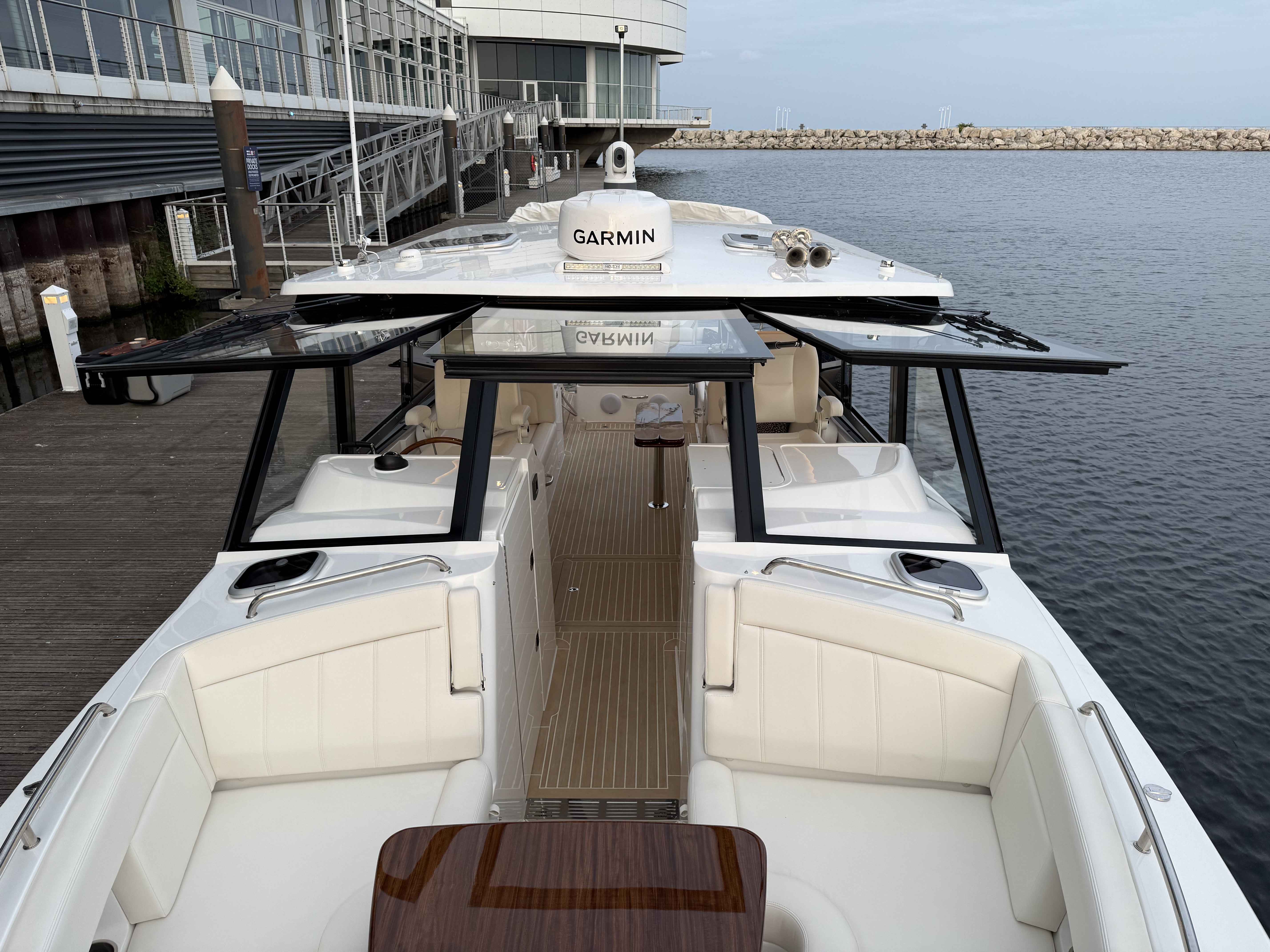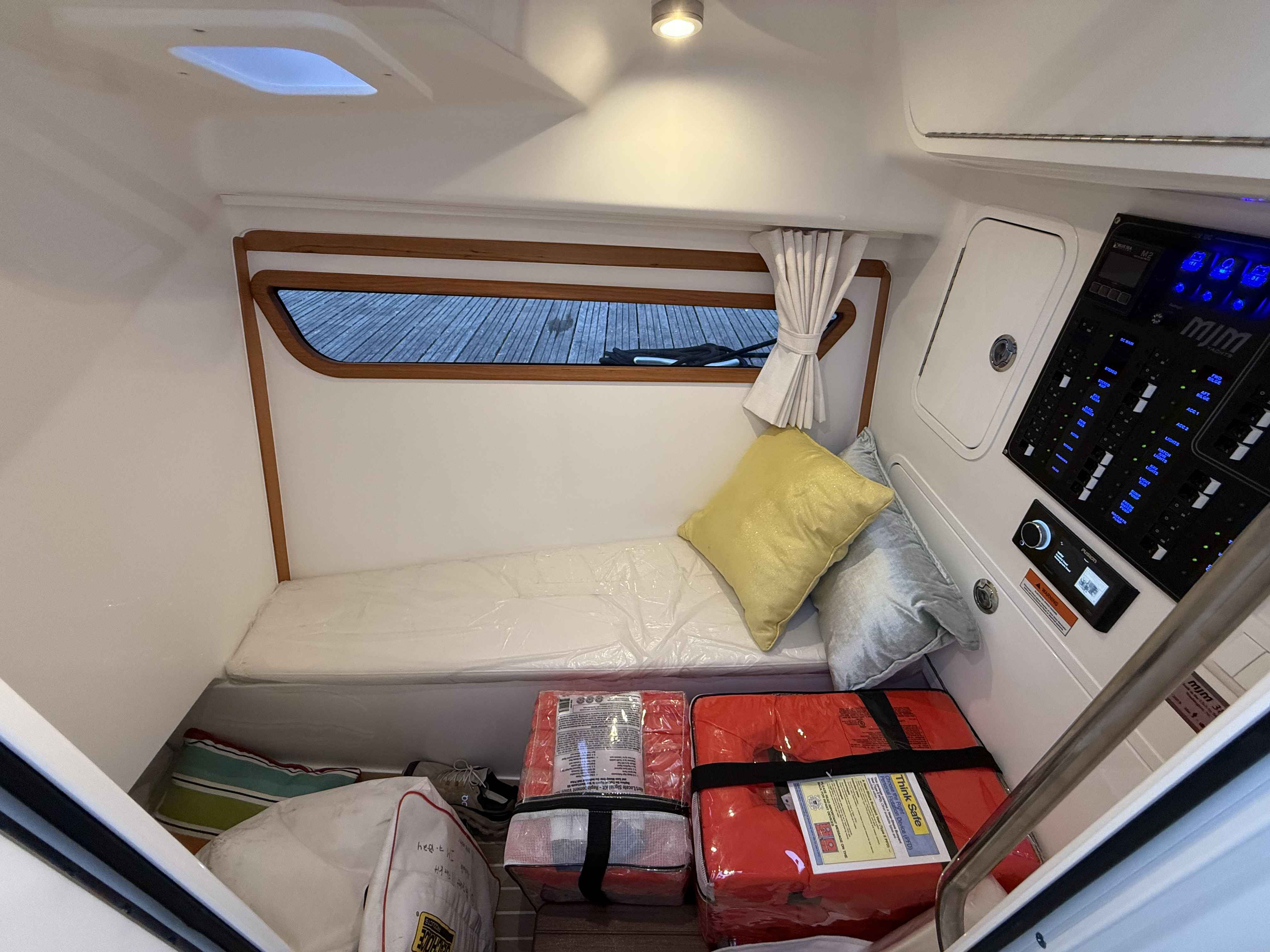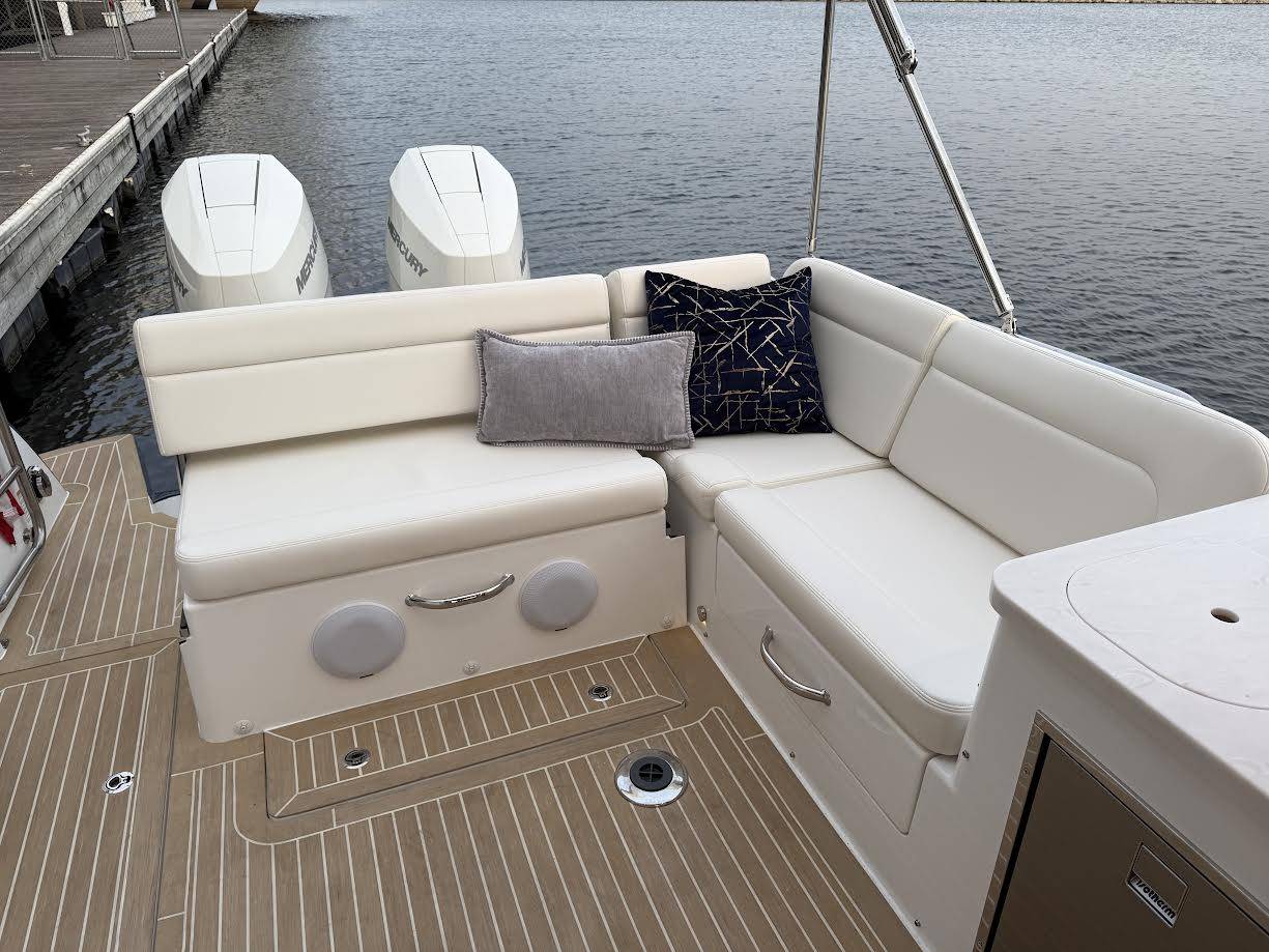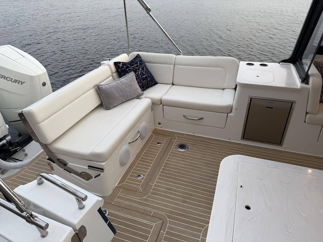 This elegant MJM 38X just arrived to our Milwaukee showroom and is stunning at every look. Please excuse the plastic covering the upholstery. We want to preserve the fresh from the factory condition of this vessel! Visit us now to witness what separates MJM from the rest.